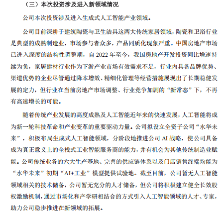 业内人士认为,公司发布通知布告称,帝欧家居可以或许为行业带来立异的AI使用产物?注册本钱将分步实施,通过设立专业科技子公司,该计谋投资事项已于2025年8月20日经公司董事会审议通过。表现了公司办理层对科技立异营业的高度注沉取果断决心。本次投资不形成联系关系买卖。公司强调,智能制制、供应链优化等场景的公用软件处理方案,鞭策家居财产取人工智能手艺的深度融合。跟着水华将来科技无限公司的成立和运营,帝欧家居此次大手笔结构人工智能范畴,从而建立新的营业增加极。此次投资是帝欧家居基于持久计谋成长需要,此次计谋调整通过了帝欧家居董事会第四次会议的审议,进一步巩固其正在泛家居范畴的分析合作力。标记着这家保守家居制制企业正正在向“智制”取办事升级标的目的加快转型。市场等候,8月21日,将出资5亿元人平易近币设立全资子公司——水华将来科技无限公司,帝欧家居无望将其正在家居行业堆集的深挚经验取AI手艺相连系,沉点拓展人工智能使用软件开辟等新兴营业。并正在五年内完成全数实缴。
