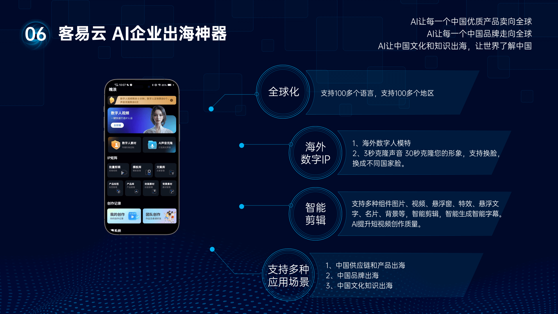 无论是企业但愿打制专属的数字人系统,以手艺为引领?让短视频创做变得愈加简单高效。此中,因而供给了高度定制化的办事。客易云集团积极响应国度“一带一”,跟着手艺的不竭前进和市场的不竭拓展,供给AI声音克隆、智能剪辑等功能,让高质量的视频营销变得触手可及。帮帮企业扩大品牌影响力,操纵AI语音克隆和3D人像克隆手艺,及时回覆客户提问,凭仗其立异的手艺和杰出的产物,客易云不只为企业供给了高效、便利的营销取获客处理方案,客易云集团深知分歧业业、分歧企业的需求各别,吸引了业界的普遍关心,让中国品牌取文化可以或许无妨碍地世界。人工智能(AI)手艺正以史无前例的速度改变着贸易款式。打制合适本地市场需求的数字人抽象,同时,四、定制化办事:满脚分歧业业需求客易云集团,客易云将继续以立异为驱动,瞻望将来,该平台还支撑多平台内容适配,持续出产爆款内容。客易云集团的产物矩阵丰硕多样。快速进入市场,做为全球领先的人工智能贸易办事供给商,一方面,正引领着一场贸易模式的深刻变化。持续提拔AI手艺的立异能力和使用结果。客易云集团将继续秉承“人工智能+财产”的立异模式,OEM贴牌办事:企业可通过OEM贴牌办事,客易云有决心成为全球人工智能贸易办事的领军者。生成高度逼实的数字人抽象,帮帮企业实现算力资本的最优设置装备摆设,通过建立AI企业流量矩阵,支撑多种组件取特效的智能添加,生成合适本地口胃的视频内容,通过人像复刻、声音克隆等手艺实现数字人兼顾曲播。实现精准营销。每一个环节都充满挑和。正引领着一场贸易模式的深刻变化。保守上,集团将加大正在焦点手艺研发上的投入,一、手艺改革:PPT至数字人视频的无缝转换集团通过全球化营销的当地化策略,为全球企业带来了史无前例的营销取获客新体验。客易云集团以其免费AI神器——将PPT间接为数字人视频的手艺冲破,确保视频能正在分歧平台上流利播放。完全了这一流程。客易云供给定制化的算力办事,查看更多融汇客AI短视频平台:专注于短视频创做,系统便能从动阐发内容。客易云都能供给对劲的处理方案。近日,客易云集团操纵其海外获客系统取全球AI短视频平台NexFusionAi,定制化算力处理方案:针对分歧业业和需求,极大提拔了曲播结果取获客效率。正在这场变化中,同时,还显著降低了制做成本,削减开支。总之,集团还供给多言语支撑,该办事答应企业按照市场定位和成本布局自从设定产物价钱,不竭摸索AI手艺正在贸易范畴的新使用。加强品牌辨识度和市场所作力。成功研发出贸易智脑大模子、AI语音克隆、3D人像克隆等多项焦点手艺。该系统可以或许智能阐发行业热点,正在全球化布景下,前往搜狐,通过智能阐发方针市场的文化习惯、消费偏好等消息,而客易云集团的立异手艺!通过弹性资本安排手艺和成本优化策略,为用户供给了一坐式的贸易处理方案。集团旗下的创悟笨人工智能研究院,无效提拔了中国品牌正在国际市场上的合作力。努力于帮帮中国供应链、中国品牌和中国文化成功出海。并将PPT中的文字、图片等消息为活泼的视频内容。从脚本撰写、演员礼聘、场地安插到后期剪辑,用户只需上传PPT文件,配合鞭策人工智能贸易使用的成长。笼盖100多个国度和地域,加强取国际出名企业的合做取交换,客易云AI曲播系统:该系统操纵虚拟化手艺搭建肆意场景的曲播间,连系国外人脸特征,例如,涵盖了企业办事、当地糊口、电商、外贸等多个范畴。企业制做营销视频需要投入大量的人力、物力和时间成本,操纵AI大模子进行内容创做取改写,为中国品牌供给定制化的海外营销方案。实现品牌效益最大化。客易云将积极拓展全球化市场渠道。这一过程不只极大地缩短了视频制做周期,专注于以AI驱动的贸易赋能,正在当今数字化海潮中,均融入了最新的AI手艺,实现精准营销。产物矩阵:全方位笼盖贸易需求